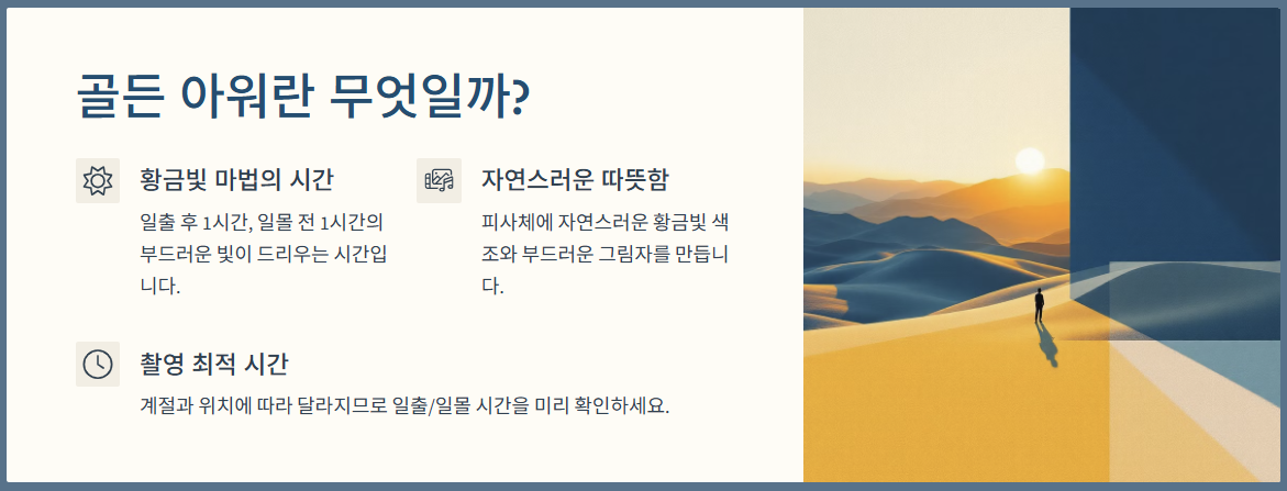 골든 아워(Golden Hour)는 해가 지기 전 또는 해가 뜨기 직전, 약 1시간 정도의 시간대를 의미해요. 이 시간대는 빛의 방향이 낮고, 색온도가 따뜻해지면서 노란빛이나 오렌지빛이 강해지는 특징이 있어요. 이 자연광은 인물이나 사물에 부드럽고 몽환적인 느낌을 주기 때문에 사진 촬영에 아주 적합하답니다.