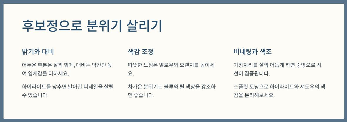 | 색온도 | +5 ~ +10 | 따뜻한 분위기 연출 |