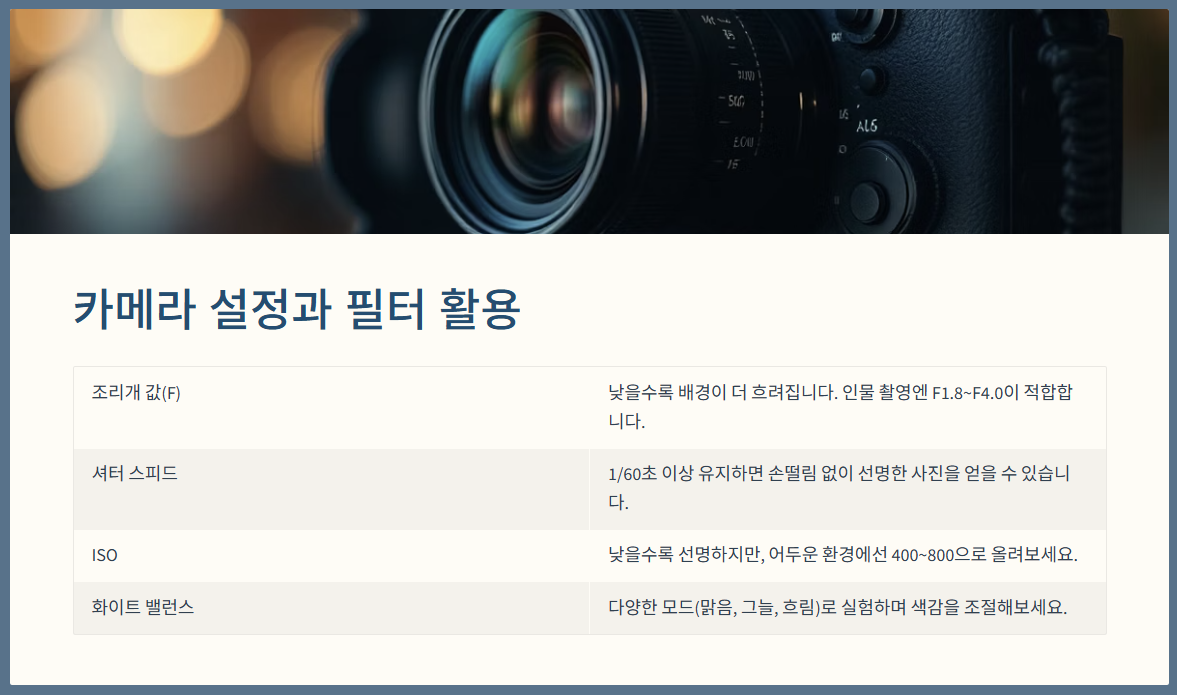 표를 참고해서 촬영 전에 간단히 설정만 바꿔도 완전히 다른 결과물이 나와요! 요즘 스마트폰 카메라도 워낙 좋아서, RAW 촬영 + 라이트룸 앱만으로도 충분히 전문가 느낌이 날 수 있답니다! 📱