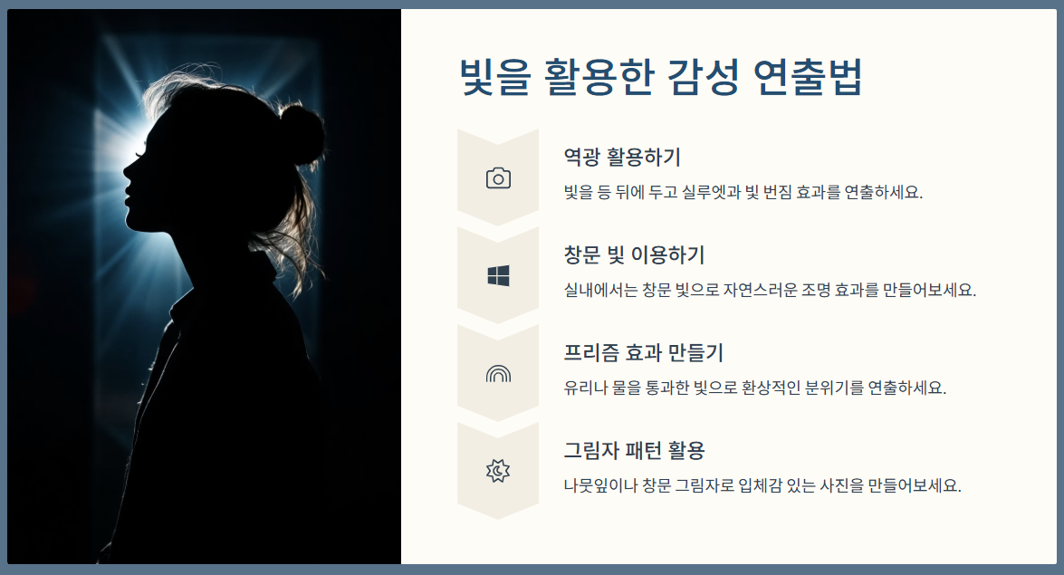 예를 들어 역광은 실루엣을 살릴 수 있고, 측광은 얼굴에 그림자와 빛의 흐름이 생기면서 입체감이 강조돼요. 인물의 경우, 얼굴 측면으로 빛이 닿게 하면 코 밑이나 눈 아래에 생기는 그늘이 자연스럽고 드라마틱하게 연출돼요.