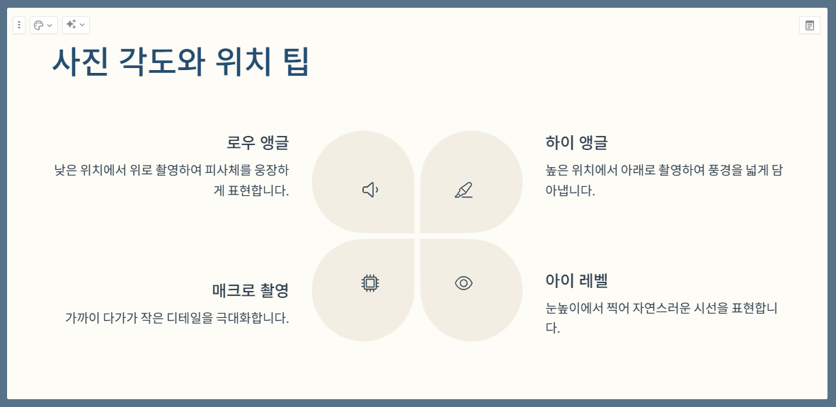 이 표를 참고하면 빛의 방향과 활용법에 따라 어떤 분위기를 낼 수 있는지 감이 올 거예요. 한 번에 다 외우지 않아도 괜찮아요! 촬영하면서 자꾸 시도해보면 점점 감이 생기기 시작해요. 😊