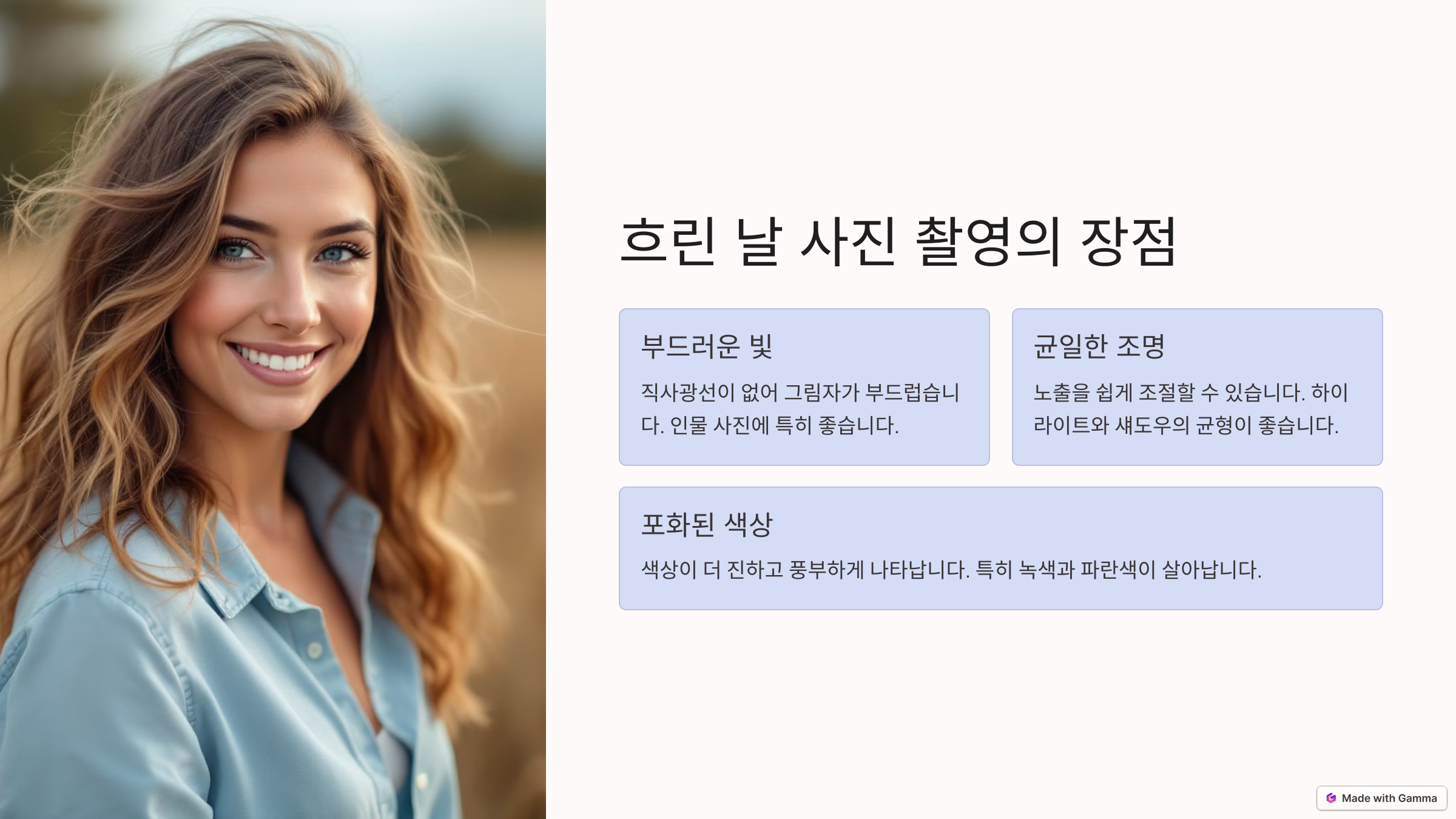 특히 인물 사진을 찍을 때 흐린 날의 자연광은 마치 스튜디오에서 촬영한 듯한 균형 잡힌 조명을 제공해요. 또한 반사광이 적어 건축물이나 풍경을 차분하고 깨끗하게 담을 수도 있어요.