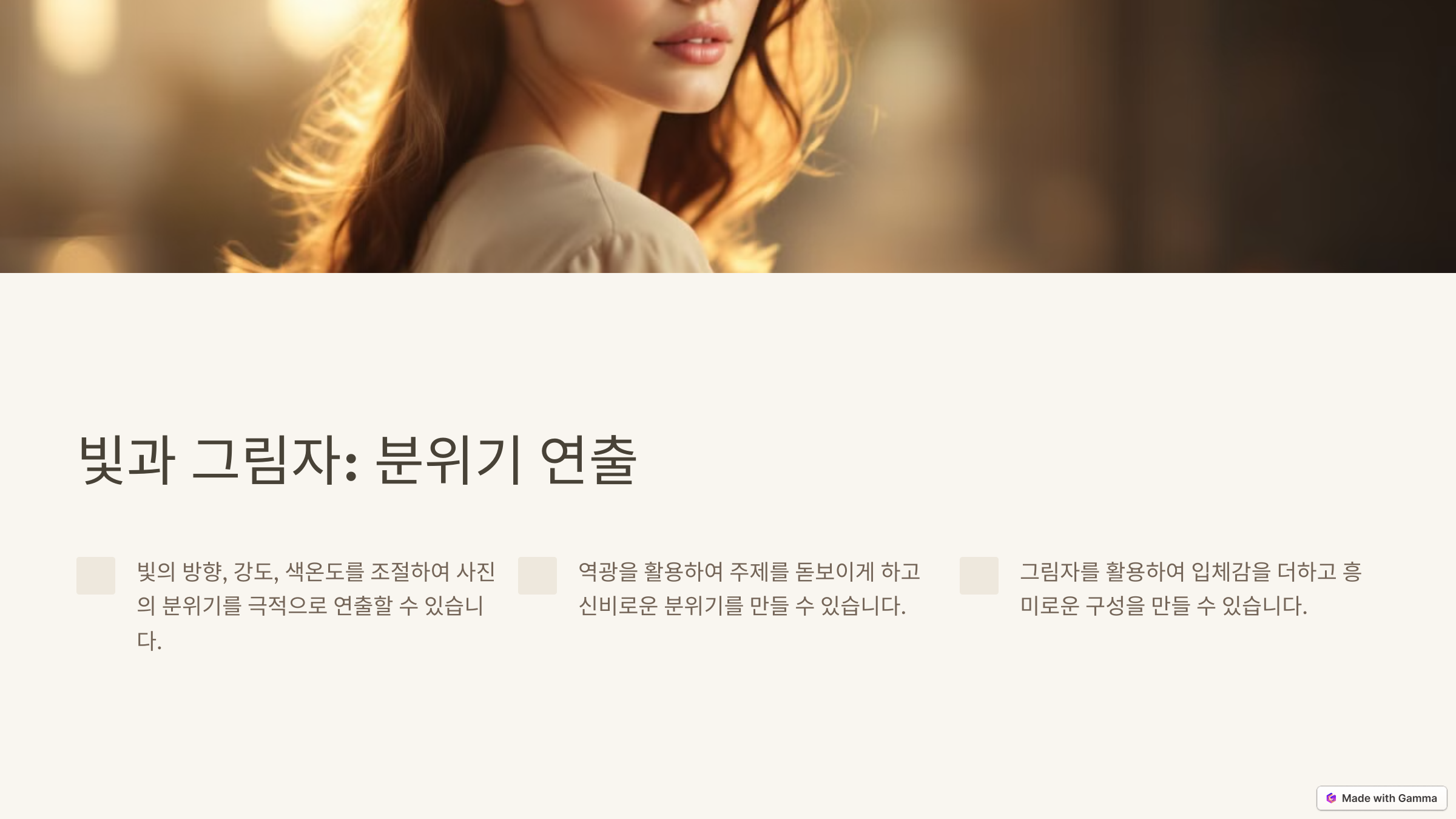 사진에서 빛은 가장 중요한 요소 중 하나예요. 자연광이든 인공 조명이든 빛을 어떻게 활용하느냐에 따라 사진의 분위기가 완전히 달라질 수 있어요. 직사광선을 활용하면 강한 대비와 선명한 그림자를 만들 수 있고, 확산광을 사용하면 부드러운 분위기를 연출할 수 있답니다.
