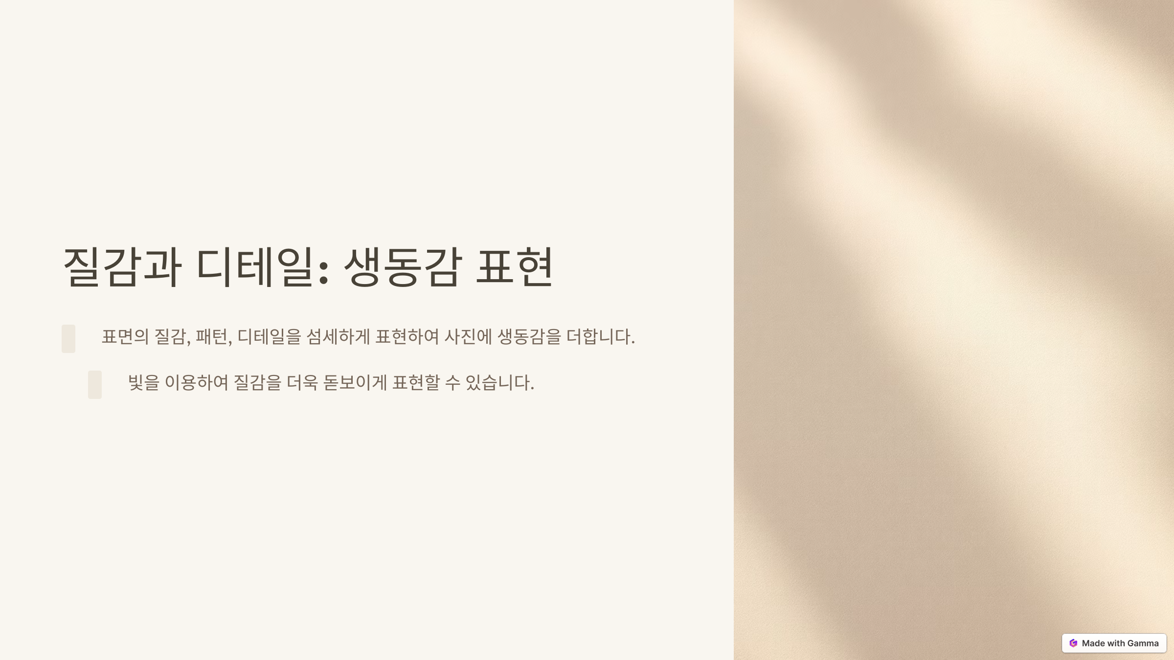 사진에서 질감과 디테일을 강조하면 더욱 생동감 있는 이미지를 얻을 수 있어요. 빛의 방향과 강도를 조절하면 피사체의 질감을 뚜렷하게 표현할 수 있답니다.