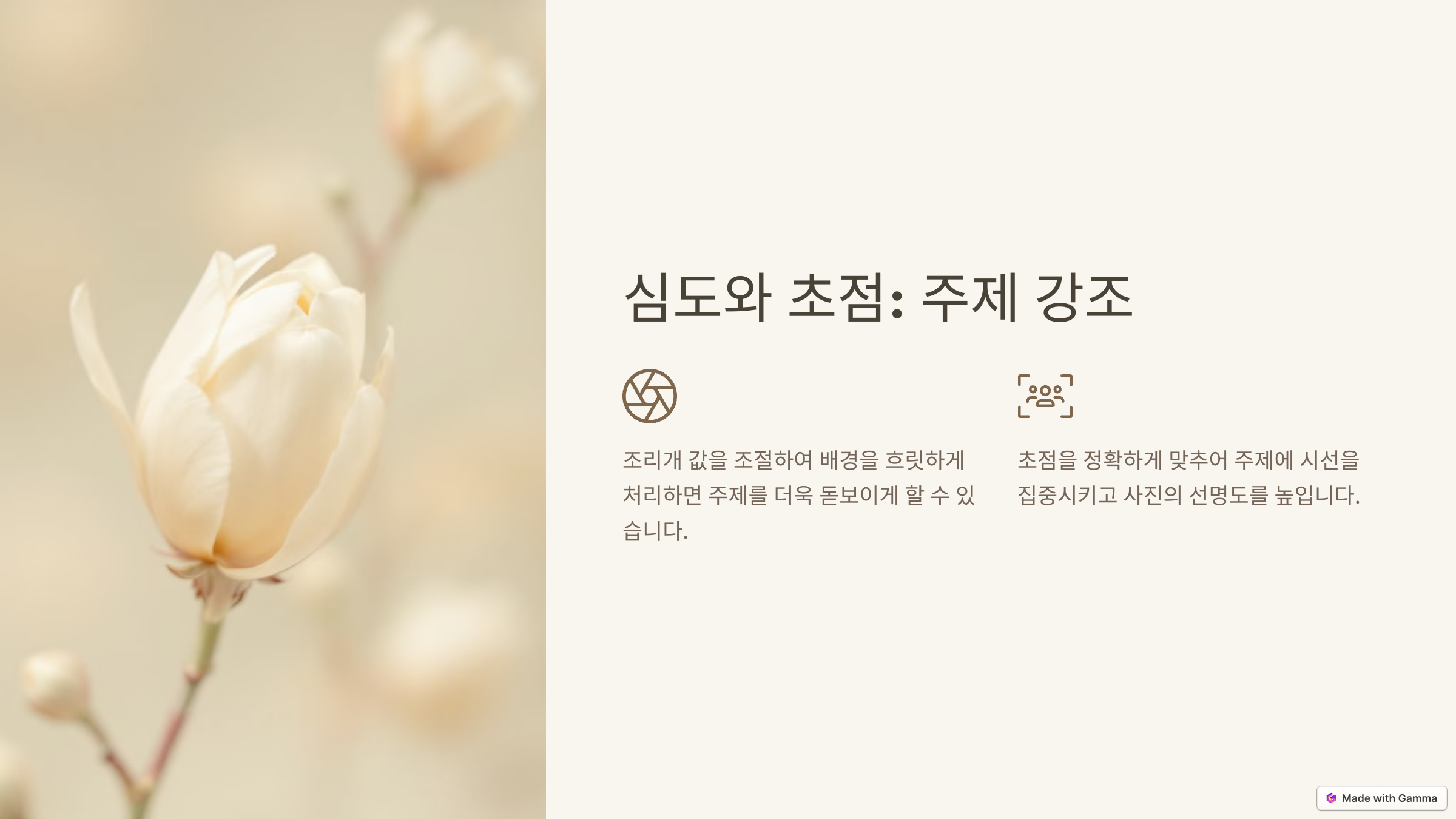 심도란 사진에서 초점이 맞는 영역의 범위를 의미해요. 얕은 심도를 사용하면 배경이 흐려지고 피사체가 강조되며, 깊은 심도를 사용하면 배경까지 선명하게 표현할 수 있어요.