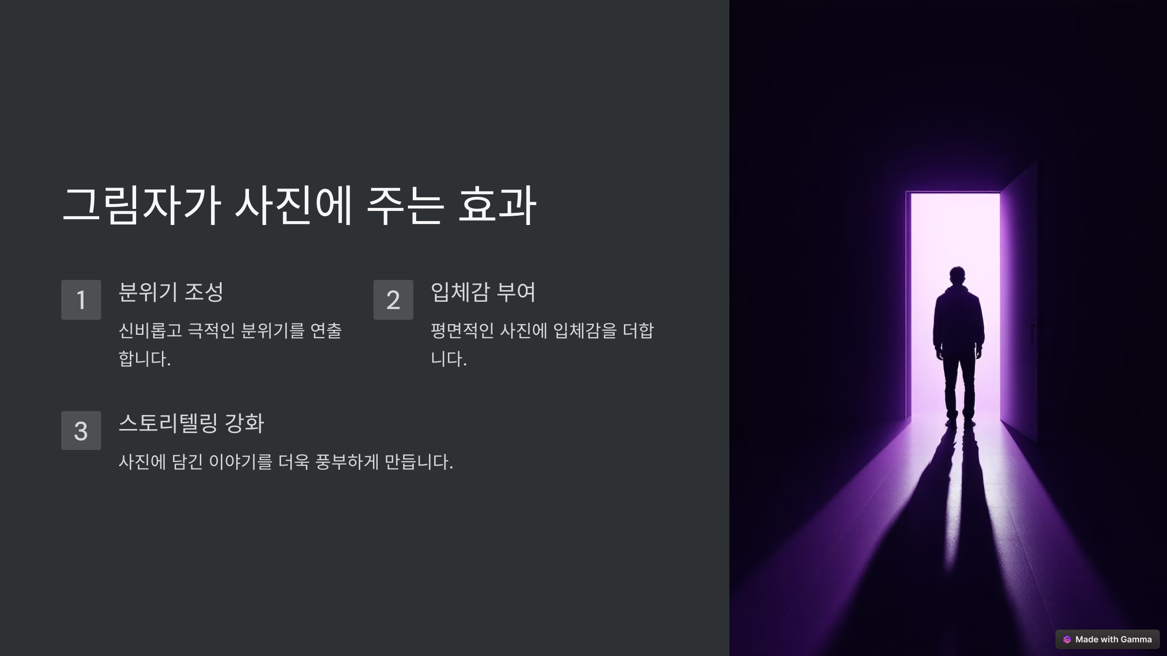 그림자를 활용하면 사진이 훨씬 더 드라마틱하고 인상적으로 변할 수 있어요. 대표적인 효과들을 살펴볼게요.