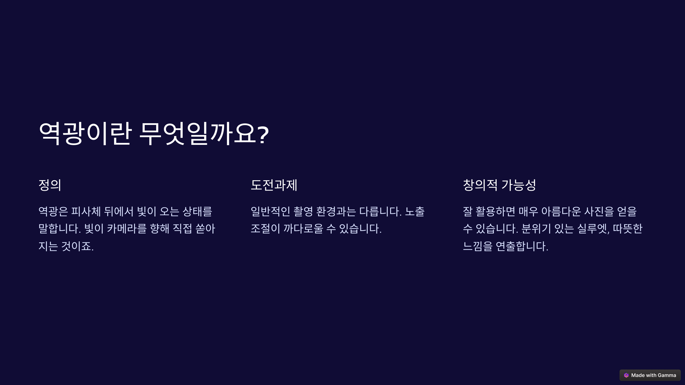 역광은 피사체의 뒤에서 빛이 들어오는 촬영 방식이에요. 즉, 촬영자가 빛을 등지고 피사체를 바라보는 구도를 의미하죠.