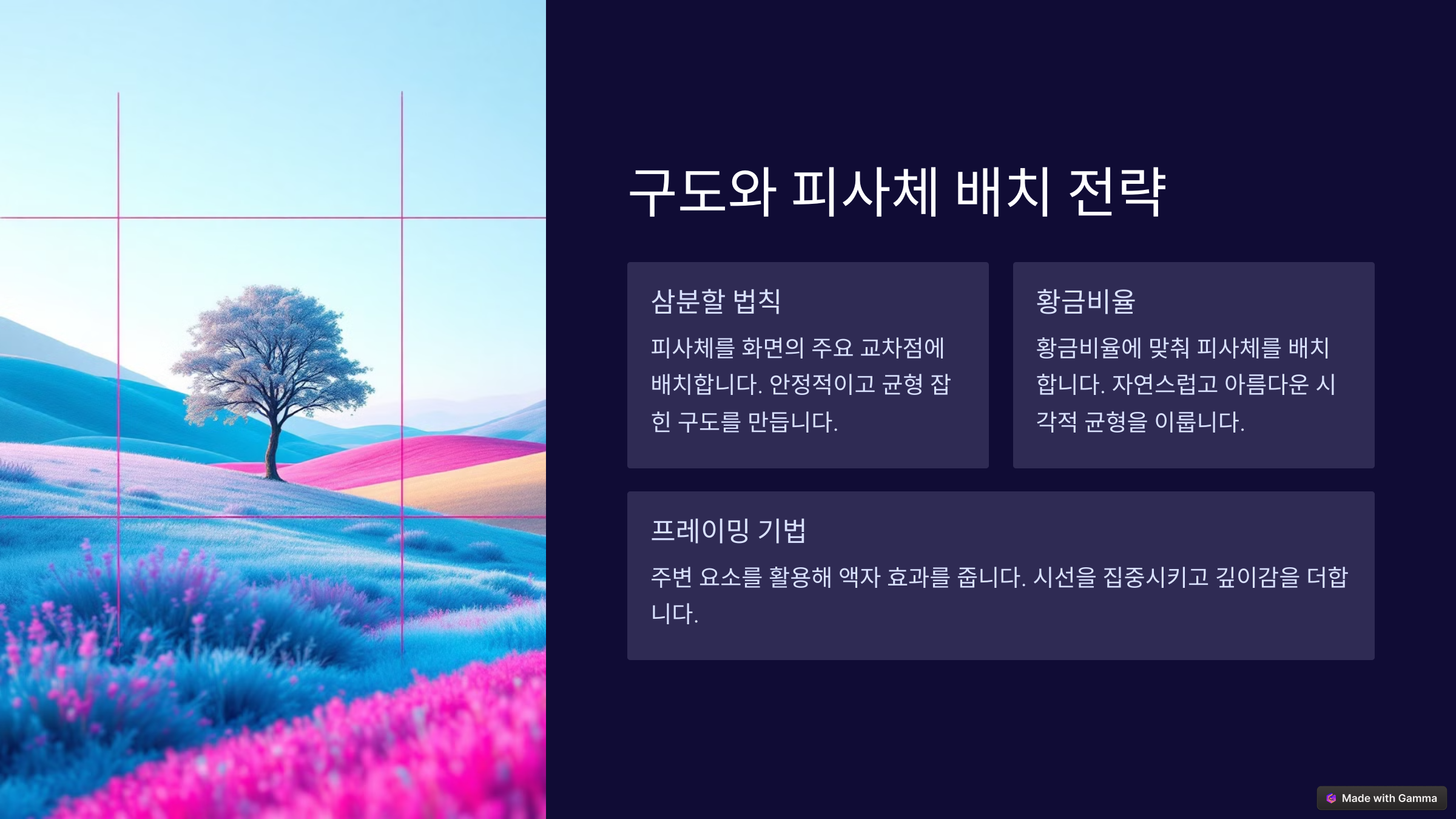 2. 삼분할 구도: 피사체를 좌우나 상하 삼분할 지점에 배치하면 더욱 균형 잡힌 구도를 연출할 수 있어요.