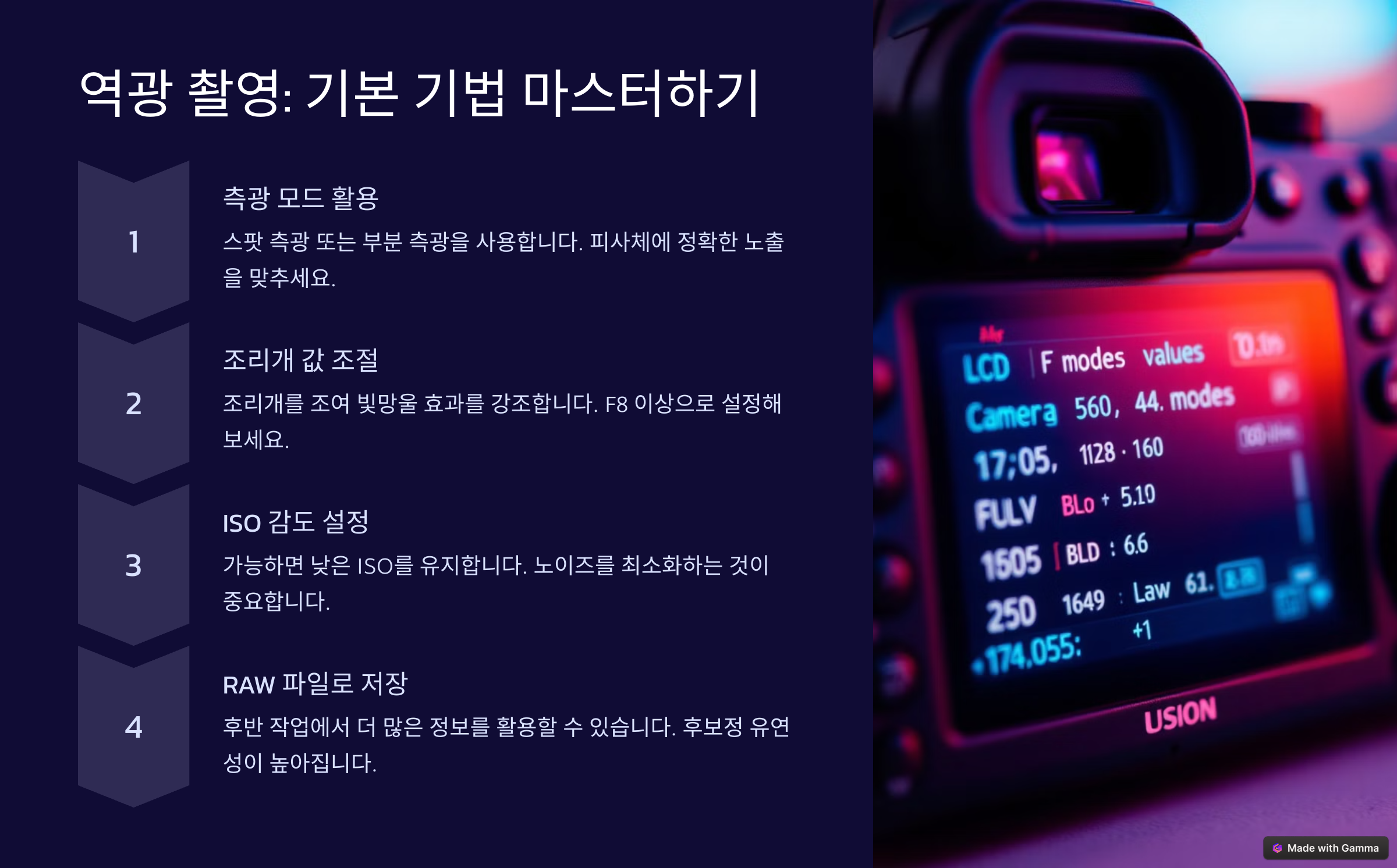 A1. 노출 조절과 피사체의 배치가 가장 중요해요. 적절한 노출을 설정하고 빛의 방향을 잘 고려해야 멋진 사진을 찍을 수 있어요.