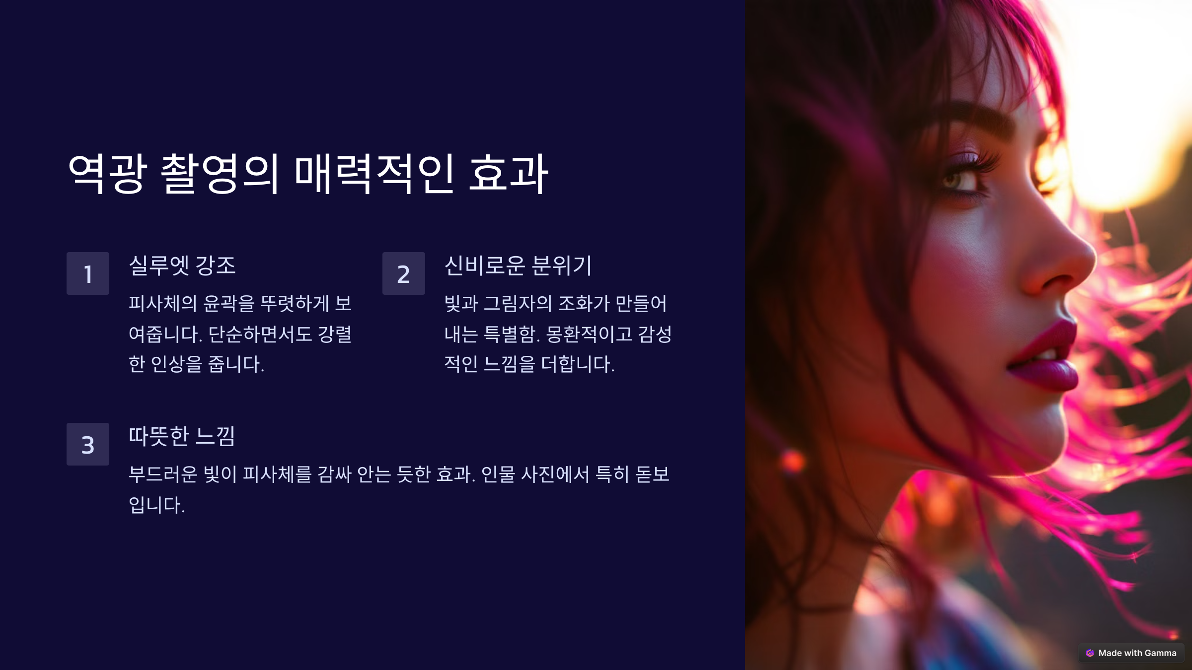 👉 머리카락에 비친 빛: 인물의 머리카락이 역광을 받으면 따뜻한 빛이 감싸는 듯한 아름다운 효과를 연출할 수 있어요.