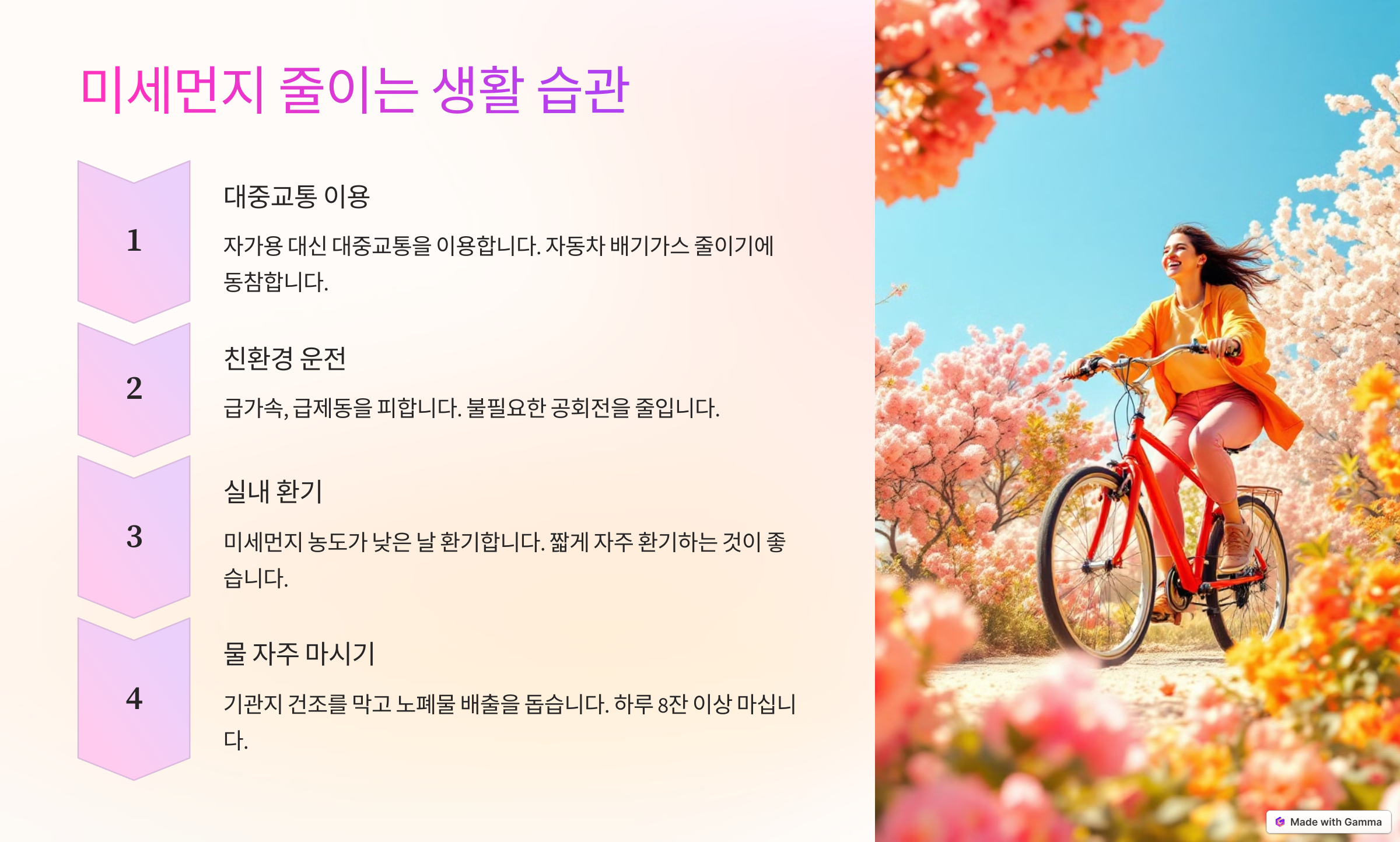 미세먼지로부터 건강을 지키기 위해서는 외출 시 마스크 착용, 외출 후 깨끗이 세안하기, 공기청정기 사용 등이 중요해요. 특히 공기 질이 나쁜 날에는 실내 활동을 늘리는 것이 좋답니다.