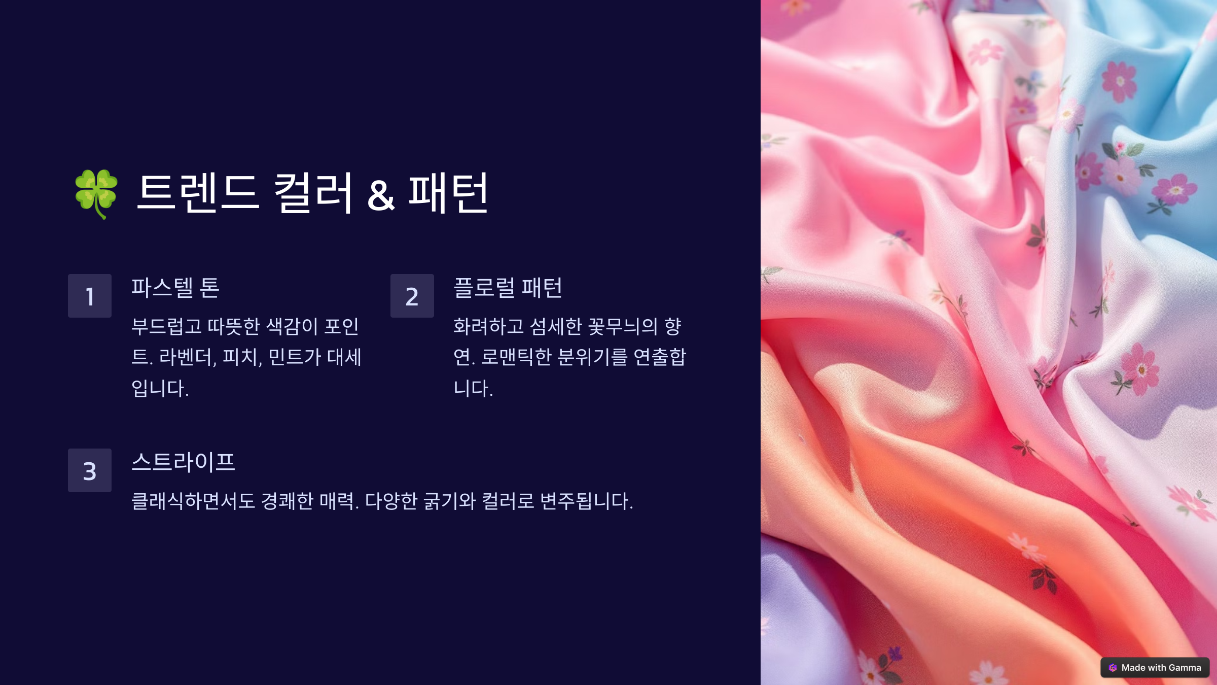 패턴 트렌드도 궁금하죠? 올해는 ‘플로럴 패턴’과 ‘스트라이프’가 강세예요. 플로럴 패턴은 여성스러운 분위기를 더하고, 스트라이프는 클래식하면서도 세련된 느낌을 줘요.